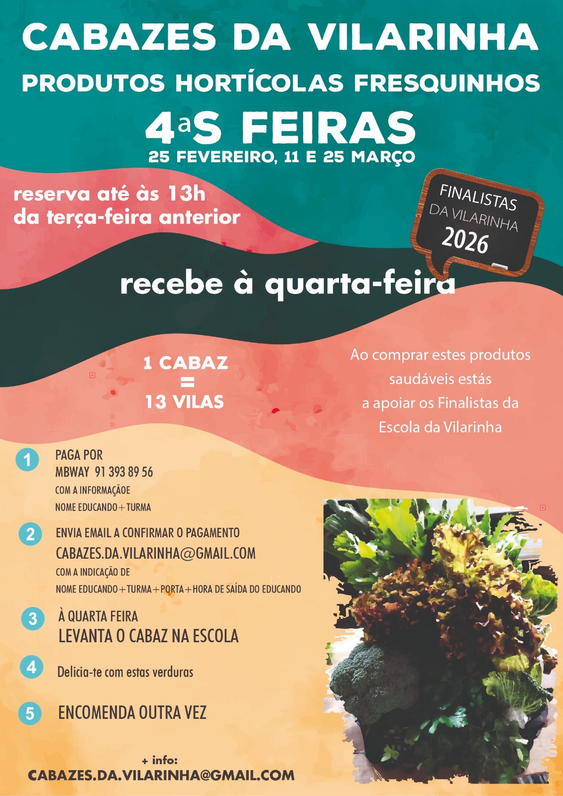 As encomendas podem ser feitas até terça feira às 13h por email: cabazes.da.vilarinha@gmail.com com envio do comprovativo de mbway, com indicação do educando, hora de saída e portão.
