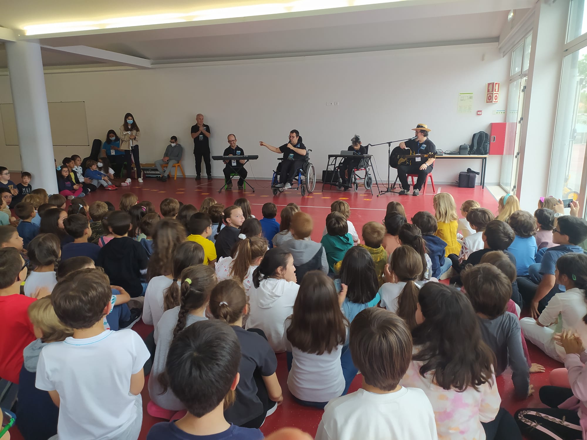 Hoje todos os alunos da escola assistiram a um concerto, no âmbito do livro, Sara e as Madalenas Mágicas. A Sara é uma aluna da Escola Manoel de Oliveira, que tem paralisia cerebral. Uma aluna muito estimulada e até faz parte da Banda Musical da Escola Manoel Oliveira. Hoje, não conseguiu estar presente na nossa escola, mas o projeto que a envolve, ou seja a banda appSOUND (constituída por meninos com paralisia cerebral) em cooperação com o CRIE esteve na nossa escola e fez com que o momento de inclusão fosse fantástica!