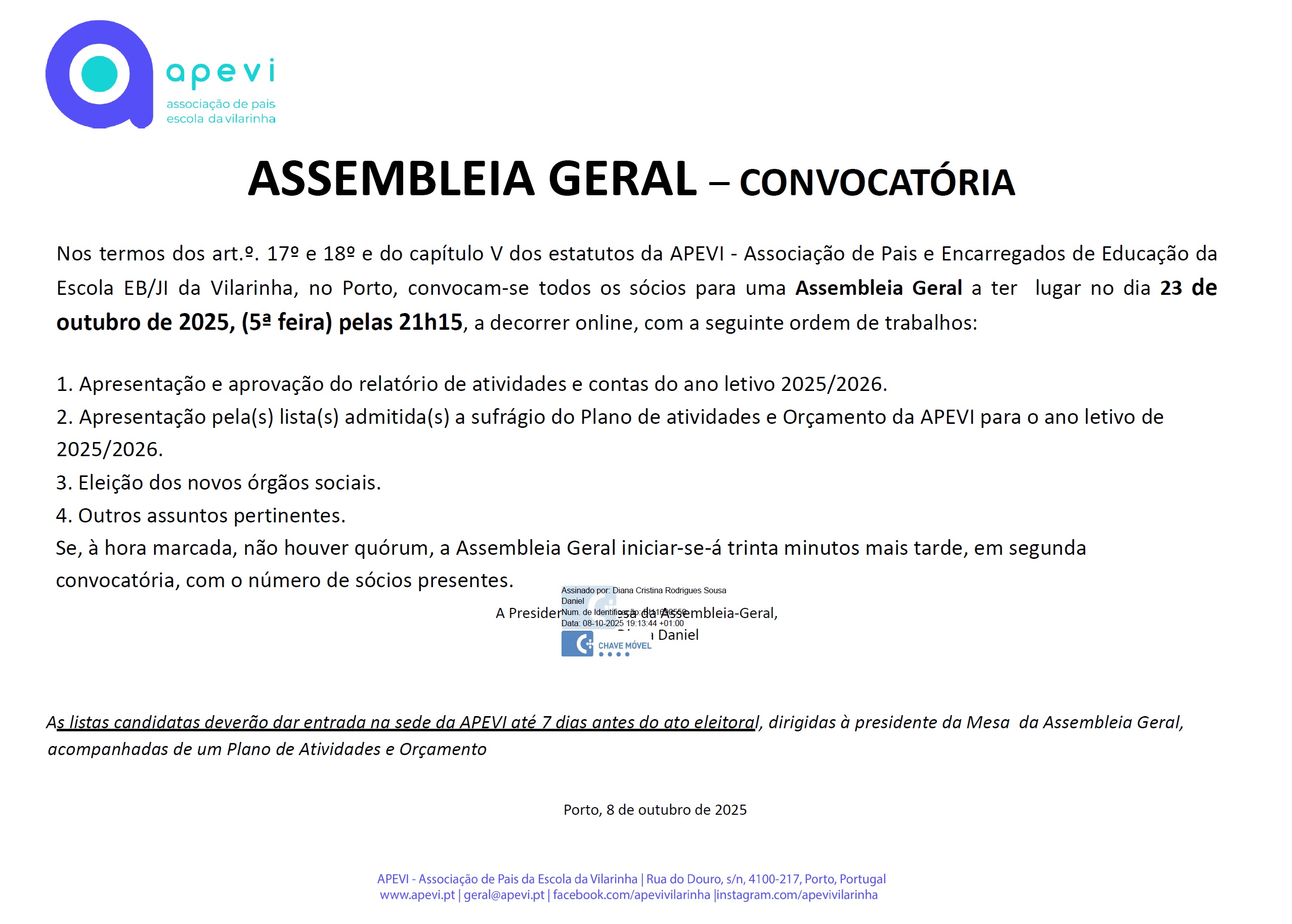 Nos termos dos art.º. 17º e 18º e do capítulo V dos estatutos da APEVI – Associação de Pais e Encarregados de Educação da Escola EB/JI da Vilarinha, no Porto, convocam-se todos os sócios para uma Assembleia Geral a ter lugar no dia 23 de outubro de 2025, (5ª feira) pelas 21h15, a decorrer online, com a seguinte ordem de trabalhos:
