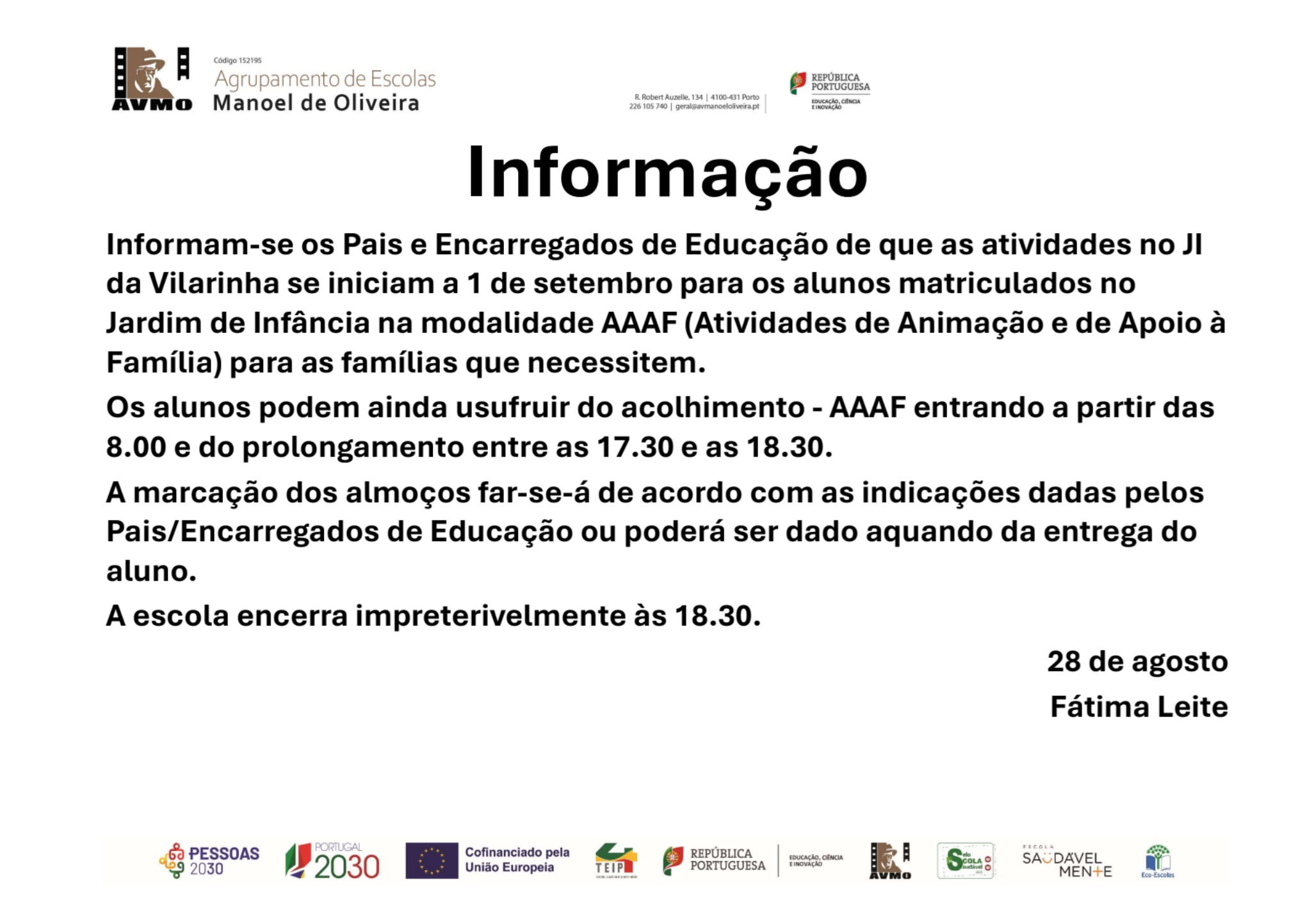 Informam-se os Pais e Encarregados de Educação de que as atividades no JI da Vilarinha se iniciam a 1 de setembro para os alunos matriculados no Jardim de Infância na modalidade AAAF (Atividades de Animação e de Apoio à Família) para as famílias que necessitem.