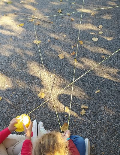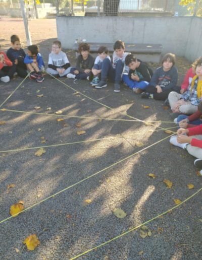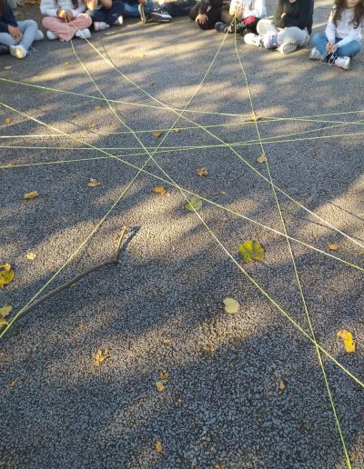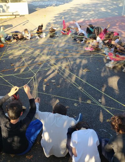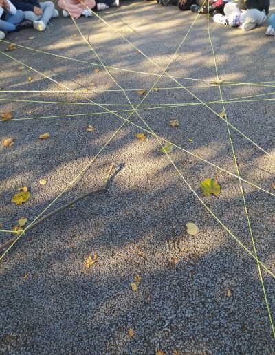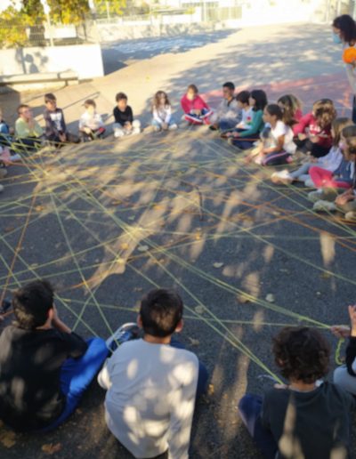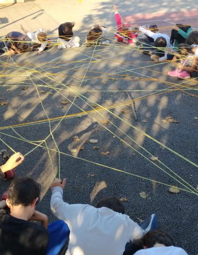Iniciou-se a construção da teia da amizade: o afilhado segurava o novelo de lã e apresentava-se, escolhia o seu padrinho/madrinha, que recebia o novelo e também se apresentava… assim sucessivamente até a teia estar toda construída. No final cantaram canção do amigo (4B) e a do Bom dia (1B)…